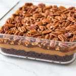 - Allow the brownies to cool completely before cutting to avoid the pecan topping from cracking or falling apart.