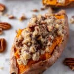- Top and Bake Again: Sprinkle the pecan streusel topping evenly over the stuffed sweet potatoes.