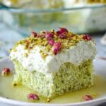 This Pistachio Milk Cake is a delightful fusion of rich pistachio flavors and creamy milk soak, layered on a moist vanilla box cake base. Enhanced with aromatic cardamom and a subtle green hue, it’s finished with luscious whipped cream, chopped pistachios, and delicate rose petals for an elegant and indulgent dessert perfect for special occasions or any time you crave a nutty, milky treat.