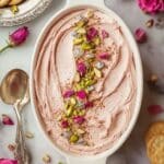 - Garnish and Serve: Remove from the refrigerator. Optionally pipe additional whipped cream on top for extra decoration. Garnish with edible rose buds and silvered pistachios to add color, texture, and elegance before serving.