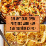 Keywords: scalloped potatoes, ham casserole, creamy potatoes, Gruyère cheese, baked ham, comfort food, casserole dish
