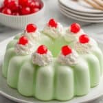 Seafoam Salad is a light and fluffy gelatin-based dessert featuring pears, lime-flavored gelatin, and a creamy blend of cream cheese and whipped cream. This refreshing and airy salad is elegantly molded and garnished with whipped topping and maraschino cherries, making it a perfect treat for gatherings or special occasions.