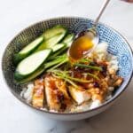 - Serve: Plate the chicken topped with charred scallions alongside cooked rice, drizzling any extra pan juices over the dish or adding a little more sesame oil and soy sauce if desired. Optionally, serve with fresh cucumbers or other vegetables to complement the meal.