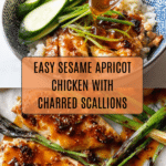 This Sesame Apricot Chicken with Charred Scallions is a flavorful and quick oven-baked dish featuring tender chicken breasts marinated in toasted sesame oil and soy sauce, topped with sweet apricot preserves and spicy chili crisp. The charred scallions add a smoky depth that perfectly complements the balance of sweet, savory, and spicy flavors. Served with rice and optional fresh vegetables like cucumbers, this dish is an easy, restaurant-quality meal you can make at home.