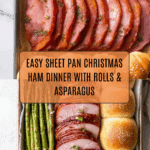 This Sheet Pan Christmas Dinner features a perfectly glazed boneless spiral ham, homemade Parker House rolls, and prosciutto-wrapped asparagus all baked on a single sheet pan. The ham is rubbed with a flavorful brown sugar, thyme, and garlic mixture, par-baked, and then finished alongside buttery soft rolls and crisp asparagus wrapped in savory prosciutto for an easy yet elegant holiday meal.