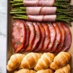 Keywords: Christmas dinner, spiral ham, Parker House rolls, prosciutto wrapped asparagus, holiday recipe, sheet pan meal
