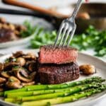 Keywords: steak dinner, skillet steak, New York strip, seared steak, asparagus, mushrooms, oven roasted steak, easy steak dinner