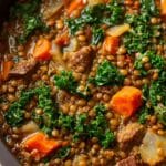 This hearty Slow Cooker Beef and Lentil Soup combines tender beef stew meat with nutritious lentils and a medley of fresh vegetables, herbs, and spices. Cooked low and slow for rich flavor development, this comforting soup is perfect for a wholesome meal, packed with protein, fiber, and vibrant greens like kale.