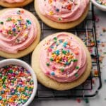 Soft Frosted Sugar Cookies are a delightful treat perfect for any occasion. These cookies are tender and buttery, topped with a creamy vanilla buttercream frosting and colorful sprinkles for a fun finish.