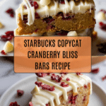 These Tasty Starbucks Copycat Cranberry Bliss Bars are a delightful combination of soft, buttery blondies loaded with dried cranberries and white chocolate chunks, topped with a creamy orange-cream cheese frosting, chopped cranberries, and a white chocolate drizzle. Perfectly sweet and tangy with a luxurious texture, these bars make an irresistible treat for any occasion.