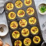 - Add Bacon Topping: Sprinkle ⅓ cup of chopped cooked bacon evenly over the top of the egg mixture-filled wells.
