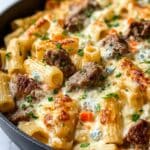 This Steak & Blue Cheese Rigatoni Bake combines tender pieces of seared steak with a creamy blue cheese sauce, tender rigatoni pasta, and a melty mozzarella topping baked to golden perfection. Aromatic onions, bell peppers, and garlic add savory depth, while fresh parsley garnishes add a bright finish. This hearty pasta bake makes a delicious and comforting meal perfect for dinner.