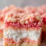 Keywords: Strawberry Brownies, Strawberry Cake Mix Brownies, Cream Cheese Frosting, Dessert with White Chocolate, Crunchy Topping, Easy Strawberry Dessert