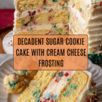 Keywords: Sugar Cookie Cake, Vanilla Cake, Cream Cheese Frosting, Holiday Dessert, Festive Cake, Cookie Dough Cake