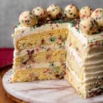 - Final frosting and decoration: Frost the cake evenly. Top with frozen cookie dough balls and extra sprinkles for a festive finish.