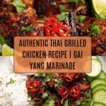 Thai Grilled Chicken (Gai Yang) is a flavorful and aromatic dish featuring boneless, skinless chicken thigh fillets marinated in a vibrant blend of lemongrass, garlic, fish sauce, soy sauces, and brown sugar, then grilled to juicy perfection. Served traditionally with coconut rice and lime wedges, it makes a perfect meal that balances sweet, salty, and savory tastes with a touch of Thai authenticity.