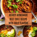 This beef chili recipe is hearty, flavorful, and perfect for any occasion when you crave comfort food. Packed with tender ground beef, beans, and a blend of spices, it’s a crowd-pleaser that’s easy to make. Customize it with your favorite toppings to create a meal everyone will love.