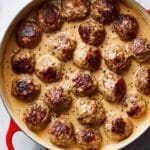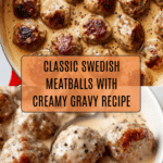 This classic Swedish meatballs recipe features tender meatballs made with a blend of beef and pork, soaked bread for moisture, and flavored with onion and garlic powders. Baked to perfection and simmered in a creamy, savory gravy enriched with beef broth, heavy cream, Worcestershire sauce, and a touch of nutmeg for warmth. Perfectly served over mashed potatoes with lingonberries and cucumber salad, it’s a comforting and satisfying meal that’s easy to prepare and delicious.