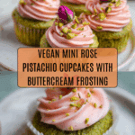 Keywords: vegan cupcakes, pistachio cupcakes, rose cupcakes, mini cupcakes, vegan dessert, plant-based cupcakes, floral frosting, holiday dessert