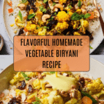 Vegetable Biryani is a fragrant and colorful Indian rice dish layered with spiced vegetables and nuts. This comforting meal combines aromatic basmati rice with a blend of warm spices, tender potatoes, cauliflower, and sweet apricots for a delightful flavor balance.