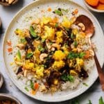 Vegetable Biryani is a fragrant and colorful Indian rice dish layered with spiced vegetables and nuts. This comforting meal combines aromatic basmati rice with a blend of warm spices, tender potatoes, cauliflower, and sweet apricots for a delightful flavor balance.