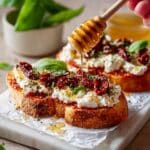 This Viral Cottage Cheese Pizza Toast with Hot Honey is a delicious and quick snack or light meal combining crispy toasted sourdough, creamy low-fat cottage cheese, tangy Rao’s marinara sauce, flavorful sun-dried tomatoes, and a hint of spicy sweetness from hot honey, finished with fresh basil and Italian seasoning for an irresistible gourmet touch.