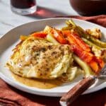Keywords: roasted cabbage, vegetarian dinner, mushroom gravy, fall vegetables, healthy roasted vegetables, whole roasted cabbage